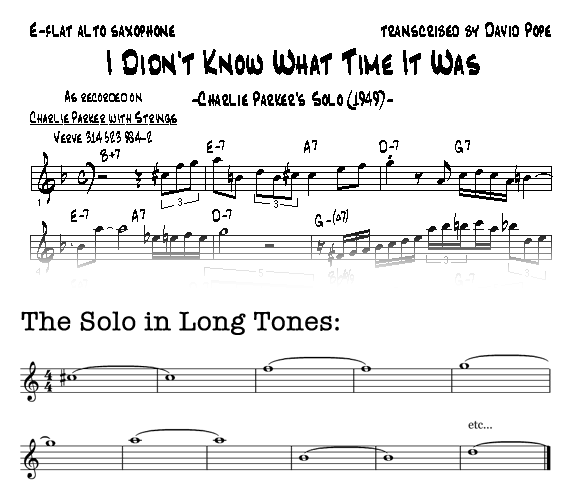 Why not practice playing a tune, or even better yet, a transcribed solo with every note lasting for 8 counts? I say that transcribed solos are preferable since they have less repeated notes, and less repetitive long tones equals less painful long tones. Here’s an example of what I’m talking about: